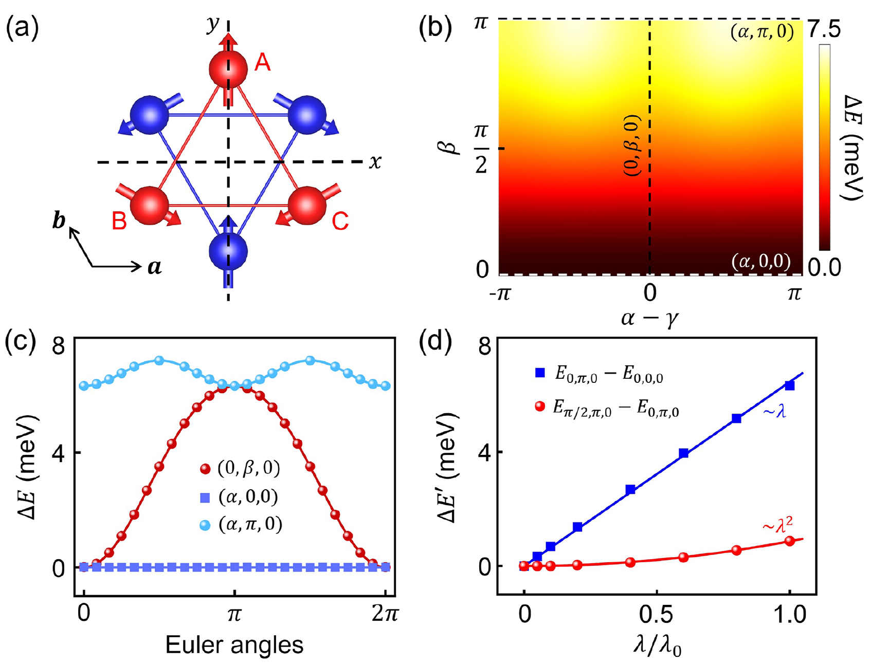 图1 Mn3Sn的磁构型和磁各向异性能。(a)磁构型。(b)根据自旋群表示理论得到的SO(3)空间中的磁各向异性能大小。(c)在特定Euler角下的各向异性能。(d)各向异性能的差值与自旋轨道耦合强度的标度关系。