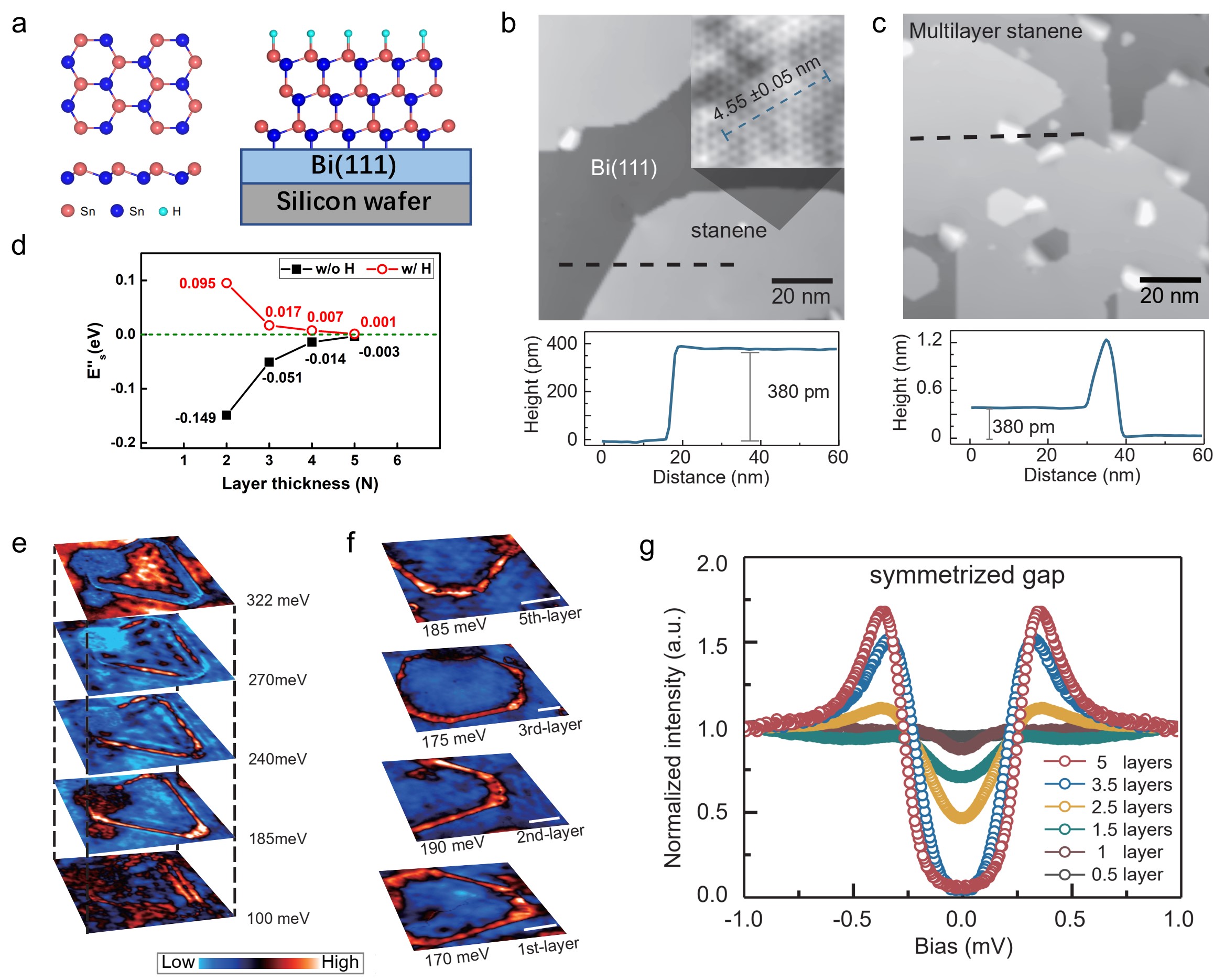 图:(a) 单层stanene与stanene/Bi(111)/Si结构示意图;(b,c)单层和多层stanene生长形貌;(d)形成能二阶差分与stanene层厚的关系;(e)不同能量对应电子态在stanene薄膜上的空间分布;(f)不同层厚stanene薄膜的边缘态;(g)不同层厚stanene薄膜上的超导能隙对比。