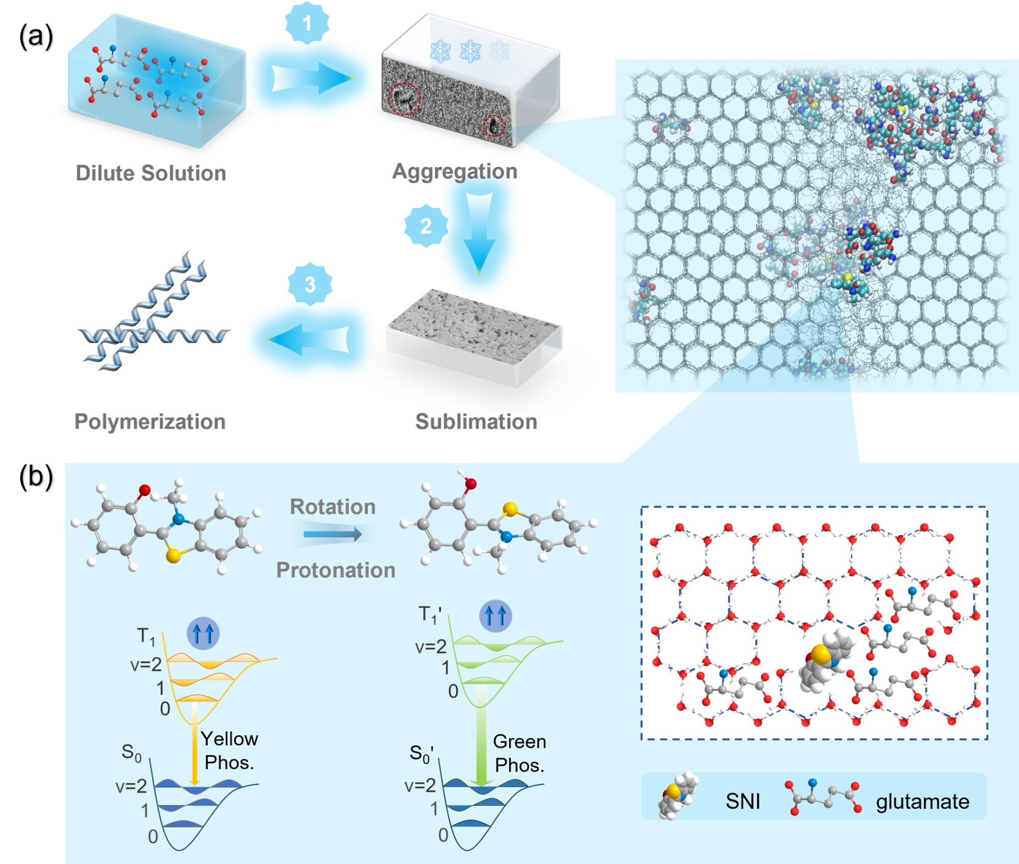 图1:冰基质中多肽形成机制(上)和磷光检测氨基酸聚集体示意图(下)